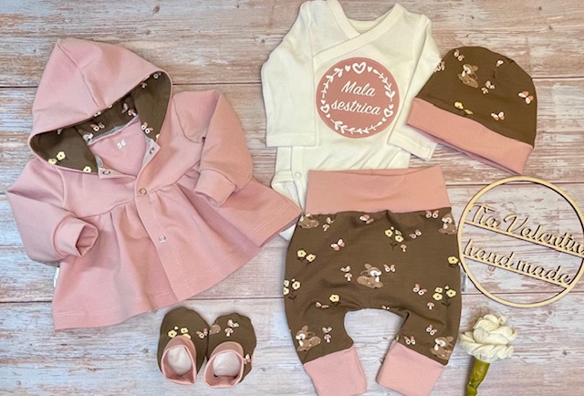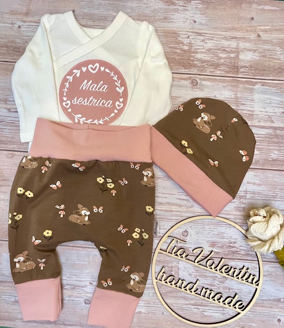 Ročno izdelano s pozornostjo na detajle – vsak kos je ustvarjen unikatno posebej za vas in z mislijo na dobro počutje novorojenčka. Body ni ročno šivan, a je skrbno izbran z občutkom za kakovost.