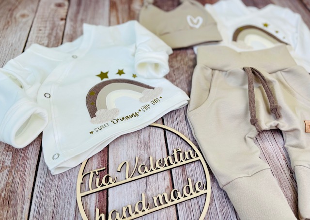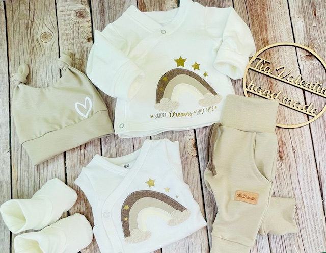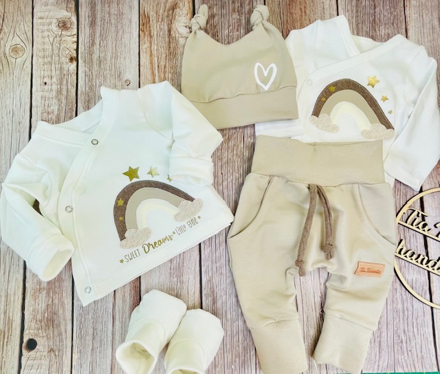 Kompletek za odhod iz porodnišnice – z motivom mavrice “Dream big”, v smetana bela in bež barvi v kombinaciji z zlatimi detajli. Kompletek je iz bombažnega materiala z elastanom, ki doda mehkobo in je primeren za vse mesece v letu.