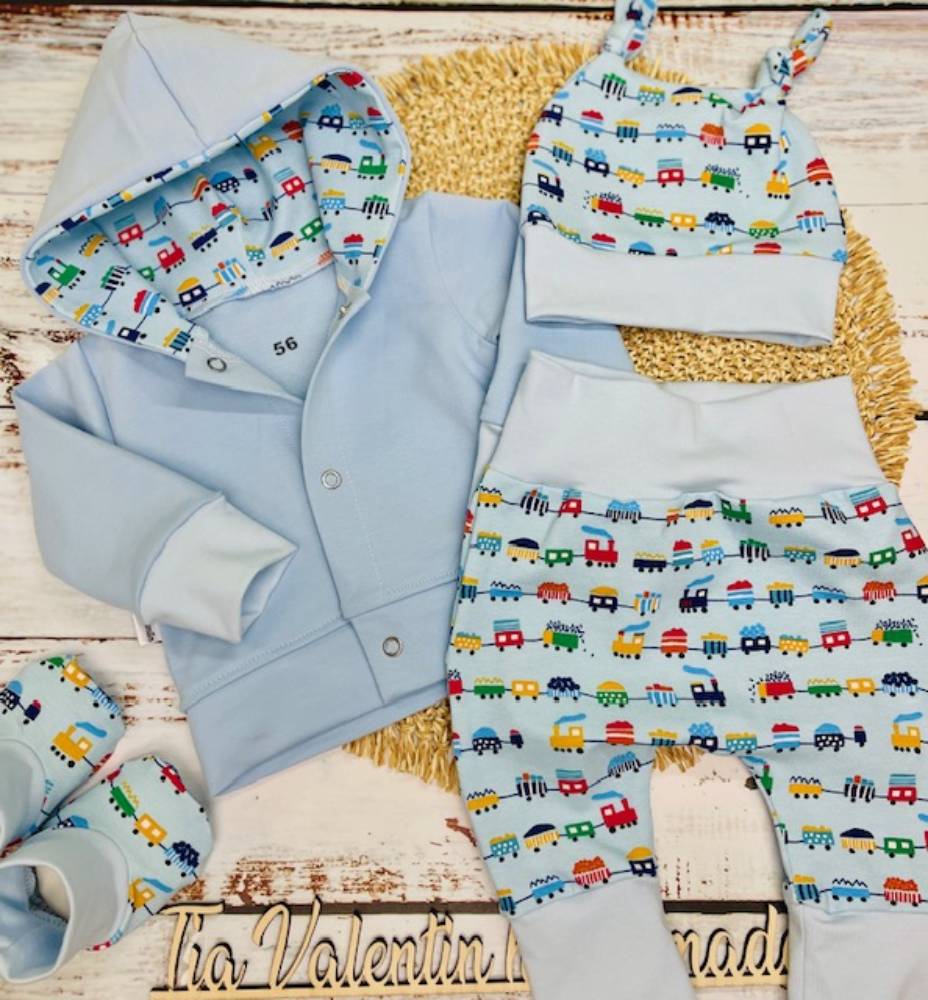 Kompletek za odhod iz porodnišnice št. 56 , svetlo moder “Vlakec”