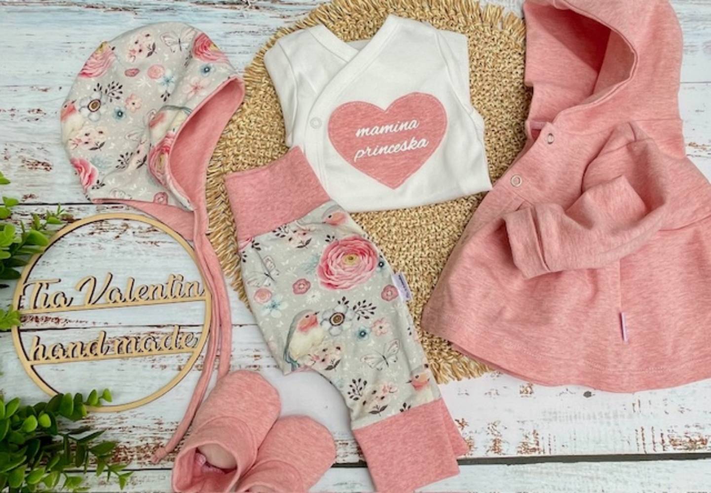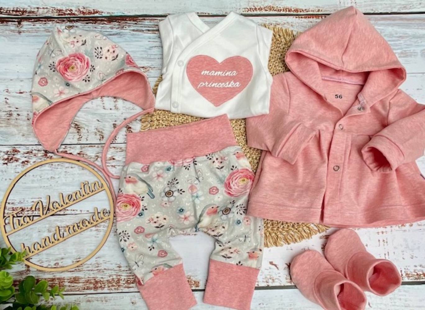 Kompletek za odhod iz porodnišnice “Mamina princeska” št. 56 melange roza motiv ptički