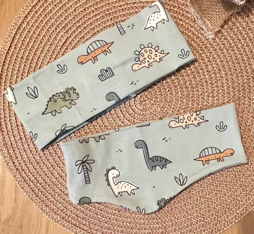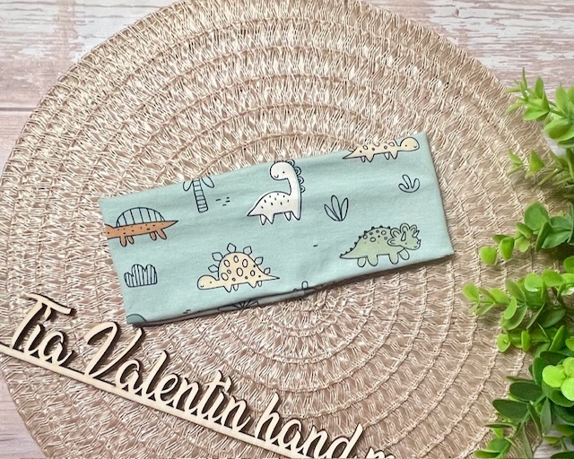 Trak za ušesa širok – motiv dinozavri na modro mint